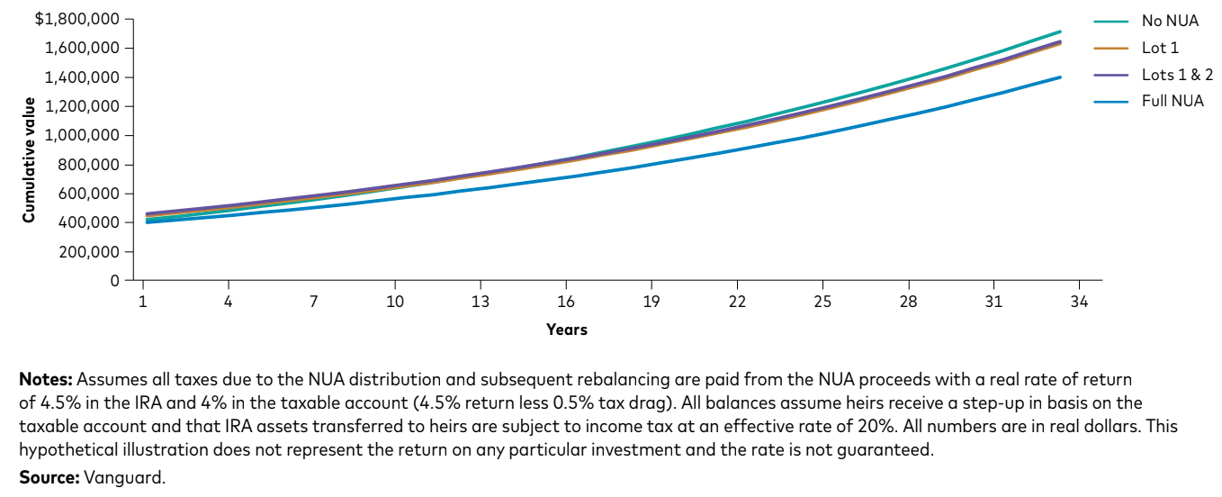 The decision to take advantage of an NUA strategy should be made with consideration about whether the investor’s objective is maximizing income, tax efficiency, or total wealth accumulation.