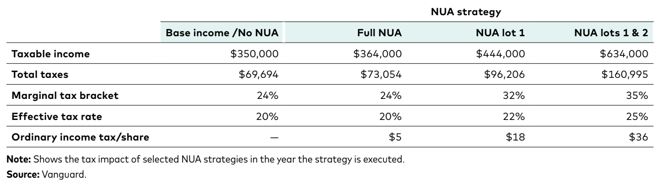 “Planning point: There is a significant trade-off in executing the NUA strategy. The full amount of the cost basis for NUA-distributed tax lots will be taxable at ordinary income tax rates in the same tax year. Investors should consider the impact of the NUA on adjusted gross income and the possibility of additional taxable transactions following the distribution. The decision to diversify the concentrated position after distribution will lead to additional tax consequences.”